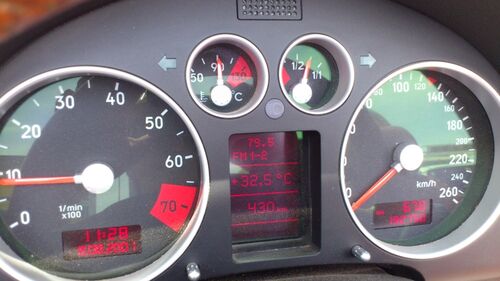 今日は初エアコン出社、車の温度計が32.5℃であります。 信号待ちでパチリでしたが、メーターに青い空が映っています。 ということは、社用車2号のアウディTT道路スター・・・・じゃなくてTTロードスターの屋根が開いているのにエアコンが掛かって涼…